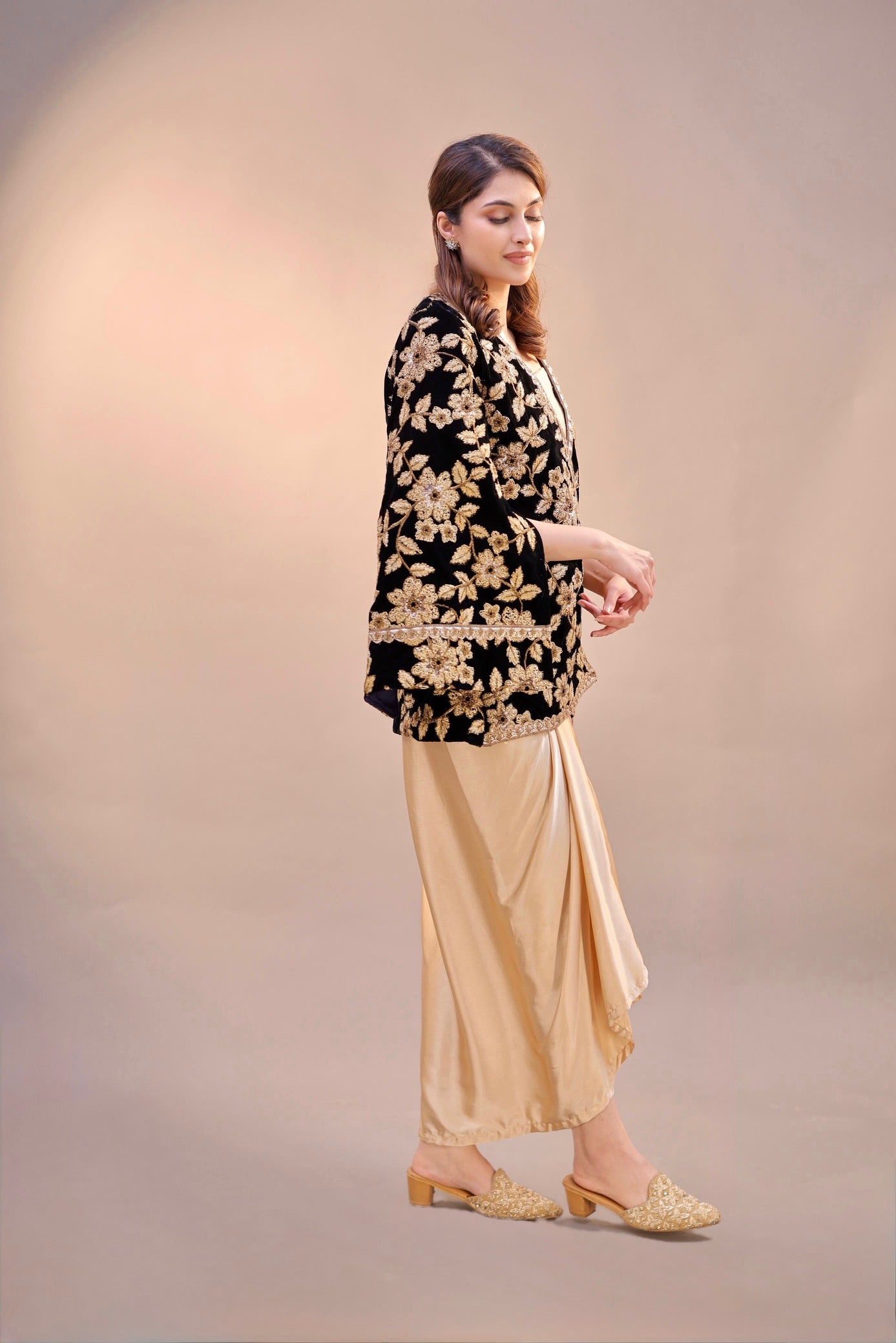 Where classic velvet meets contemporary satin, this black blazer-skirt set redefines festive sophistication with a bold edge.