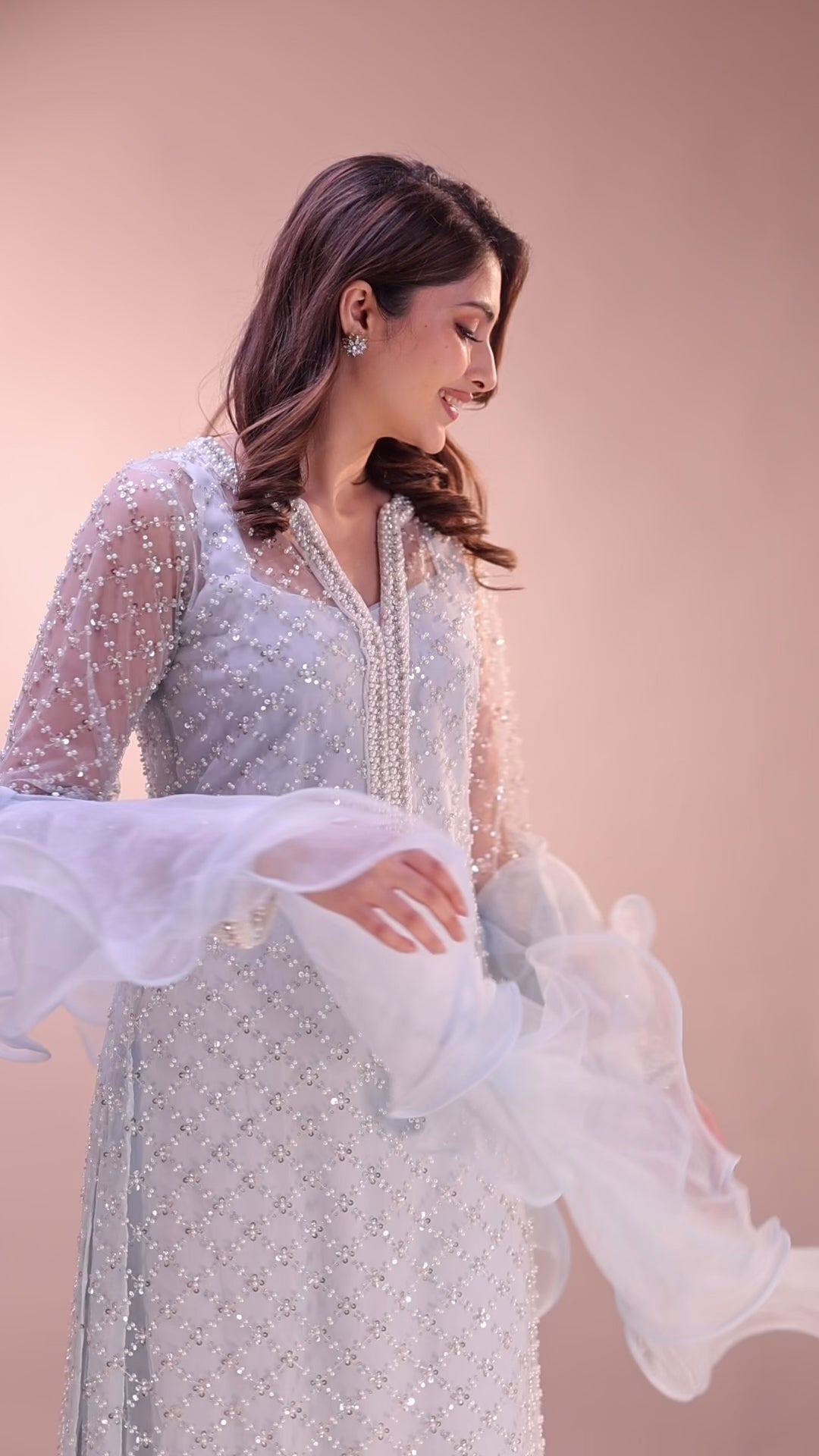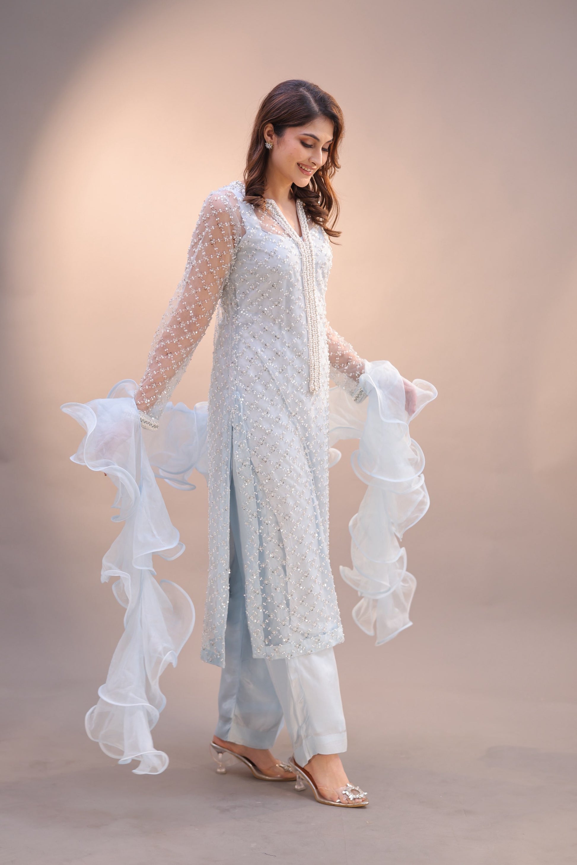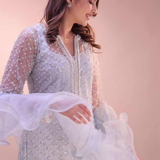 Crafted in a serene pastel blue tone, this bejeweled suit radiates subtle sparkle and refined sophistication.