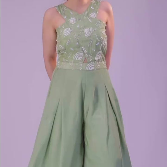 Whether you’re attending a mehendi brunch, a festive soirée, or just dressing up for yourself— our Elira Green Jumpsuit brings quiet confidence and timeless charm to your wardrobe. Crafted in a serene sage-green fabric with delicate hand-embroidered motifs, this contemporary jumpsuit redefines ethnic wear for the modern muse. The asymmetrical neckline adds a touch of boldness, while the flowy silhouette keeps it effortless and flattering.
