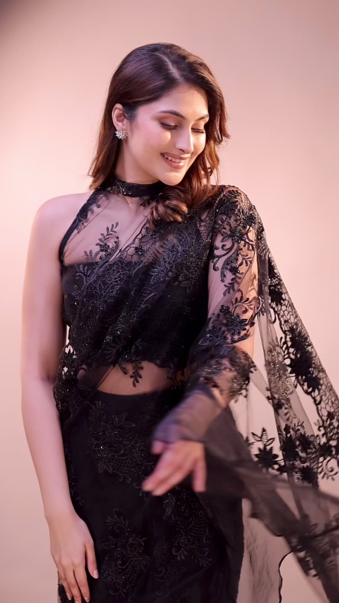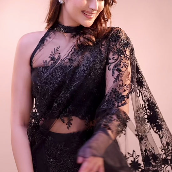 An effortlessly elegant black ensemble where fluid satin meets delicate net, perfect for evening soirées and statement occasions.