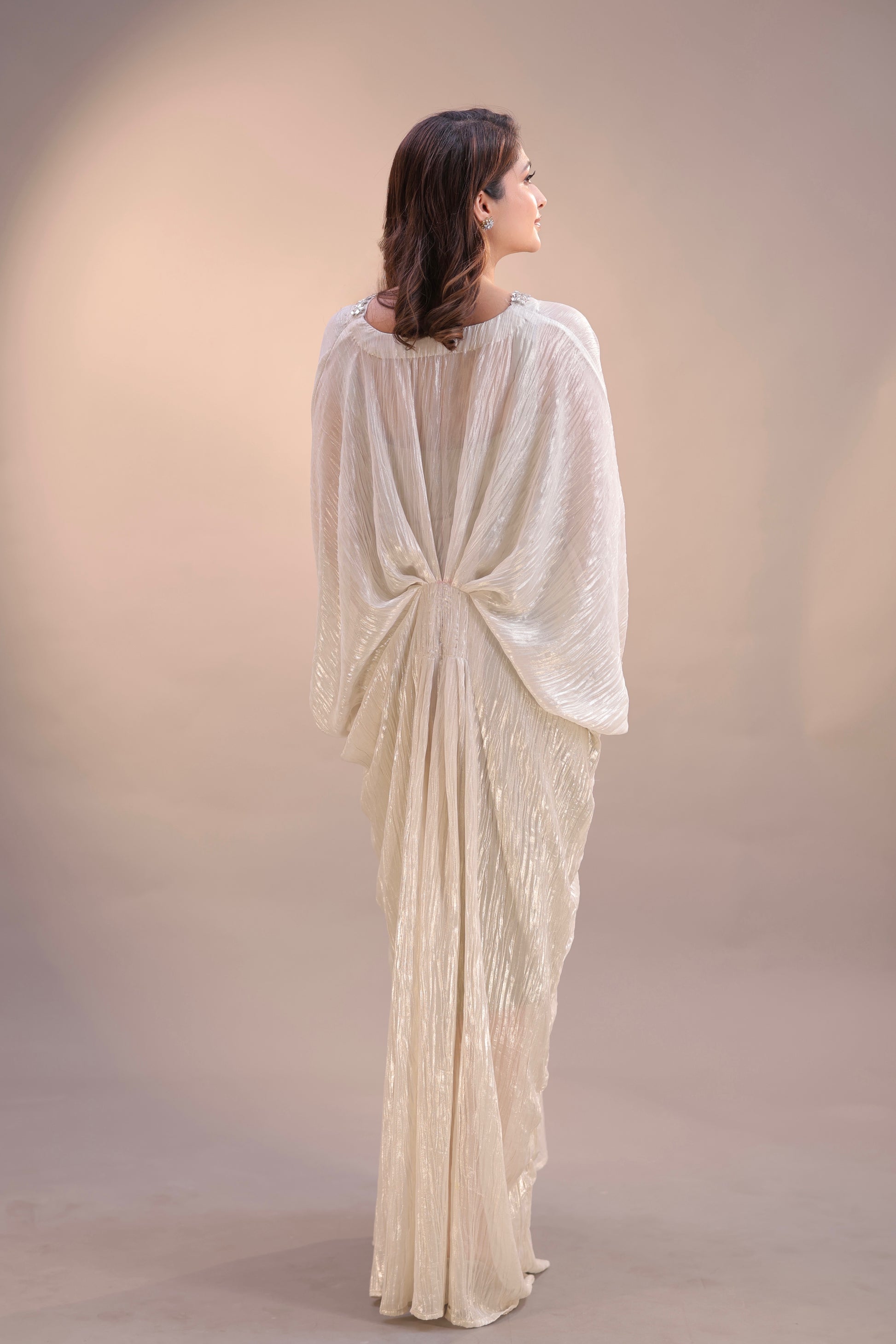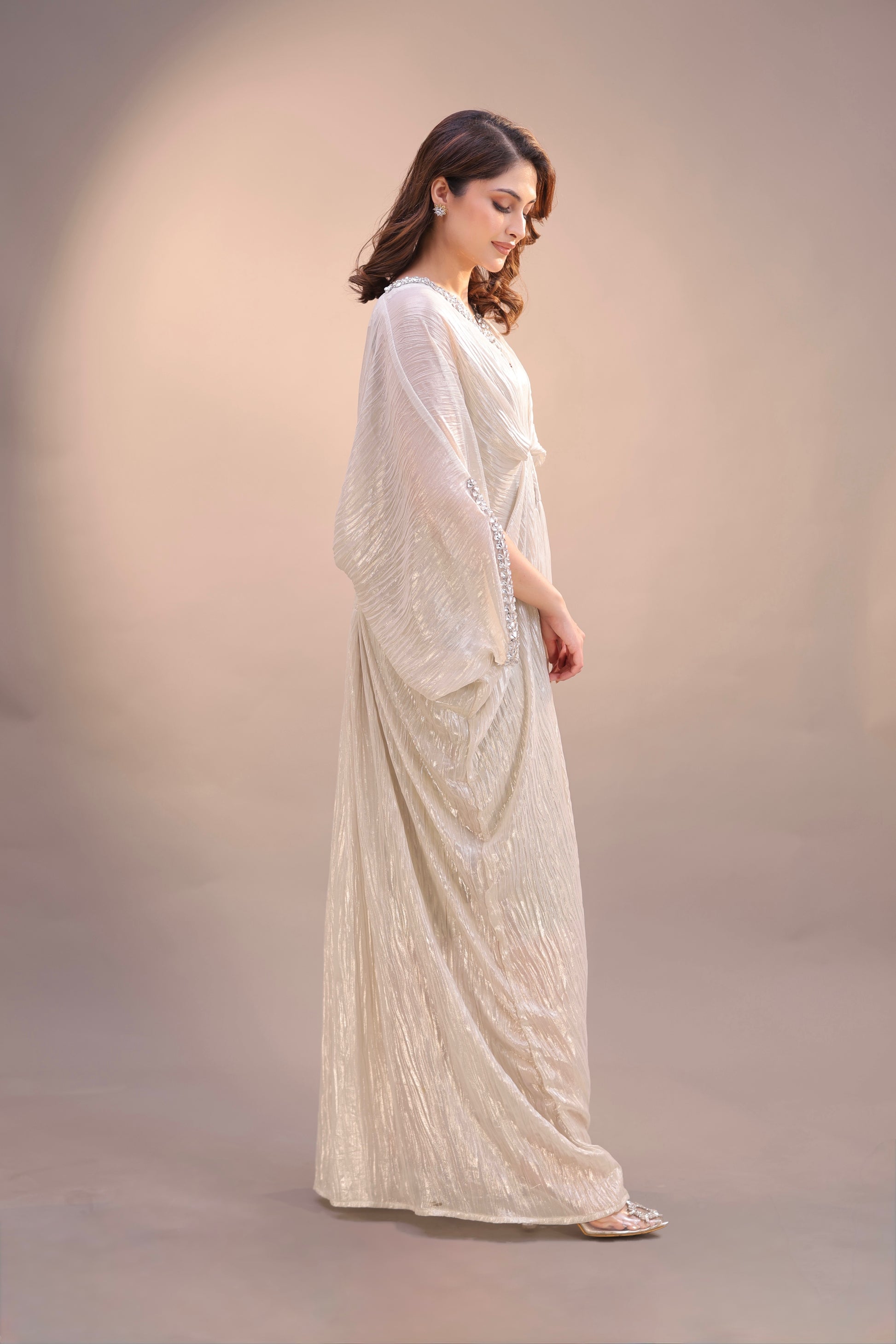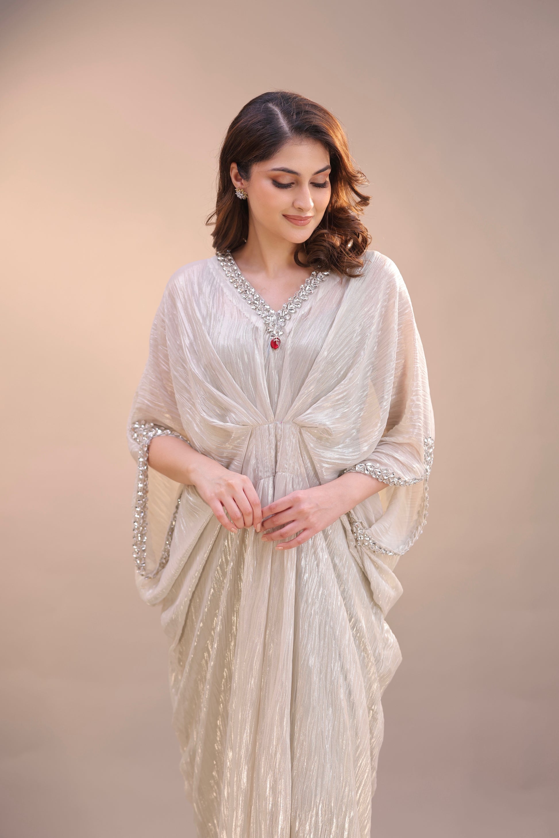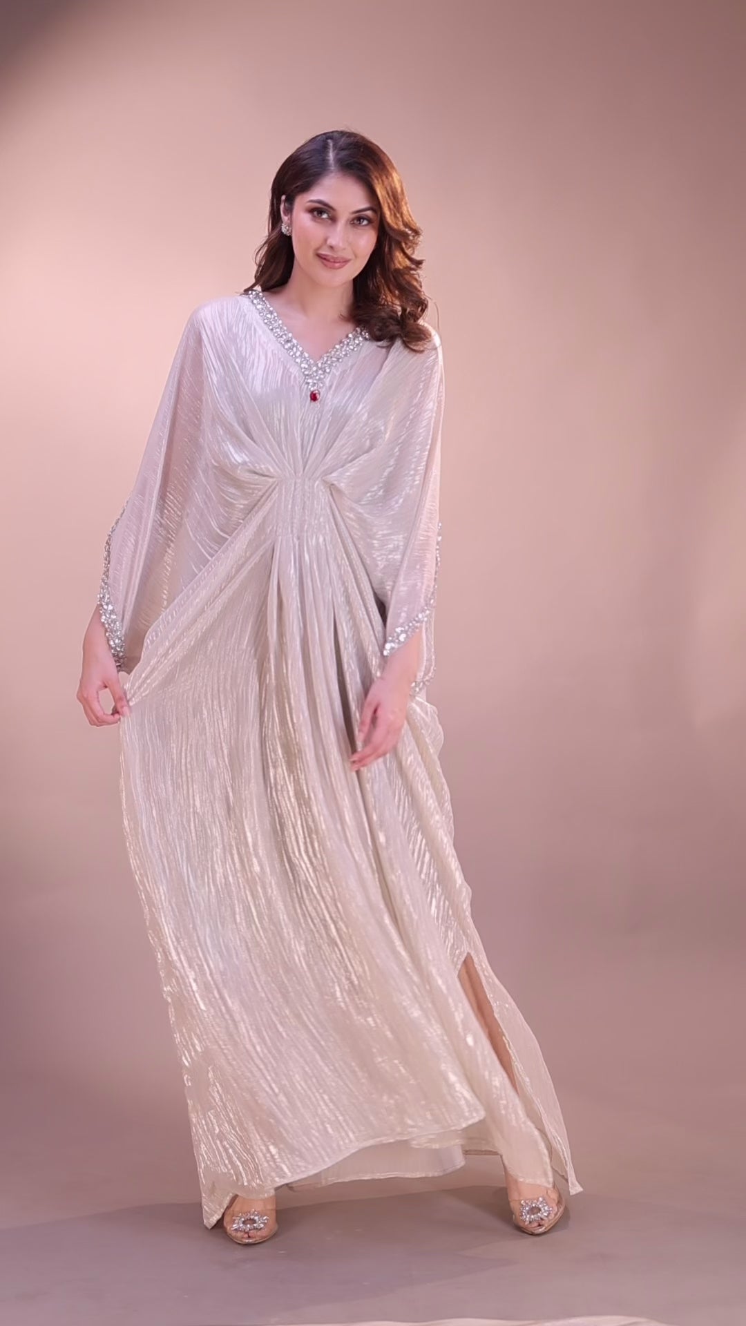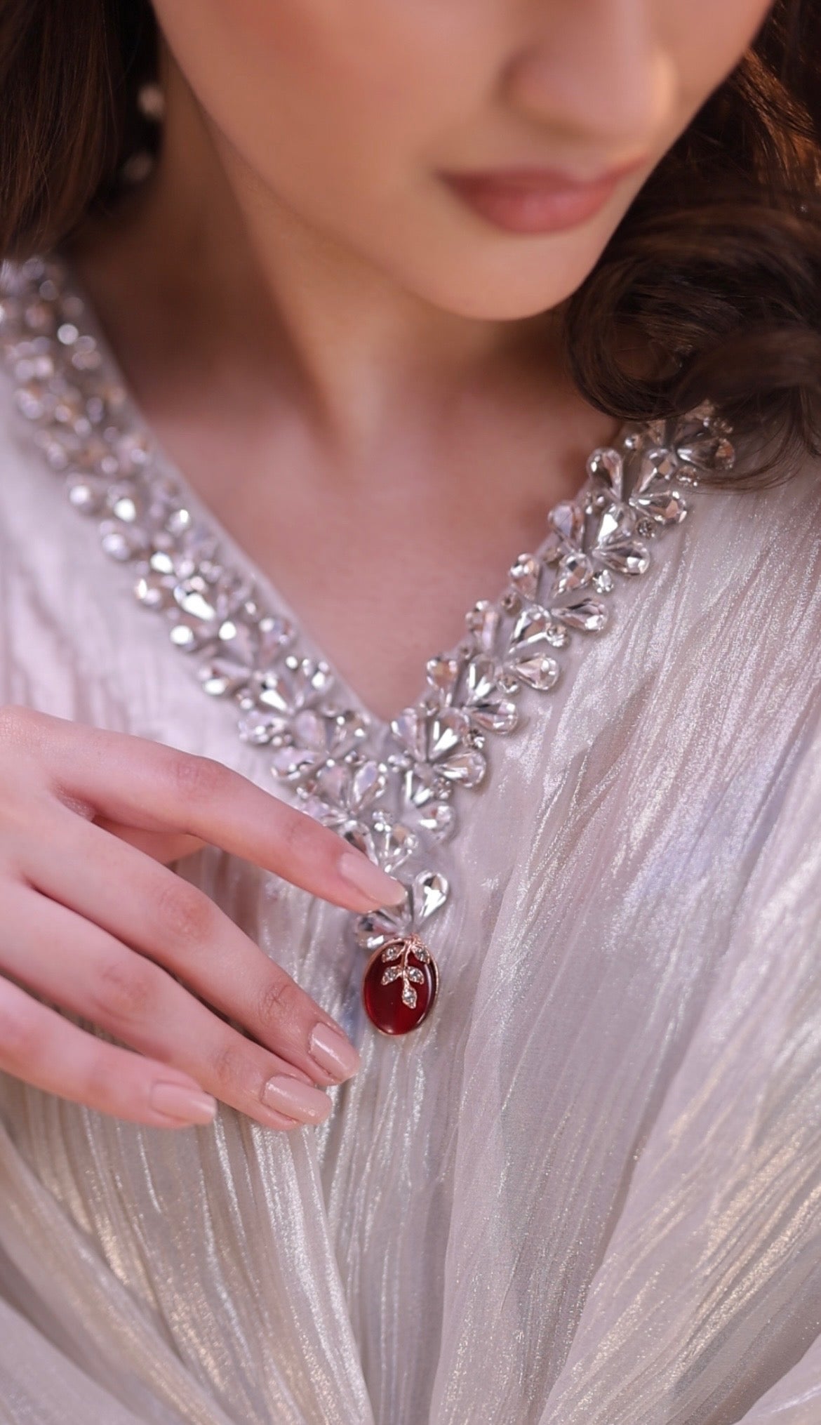 Our bestseller silver kaftan shimmers with understated grace, accented by a bold ruby centerpiece that adds depth, drama, and distinction.